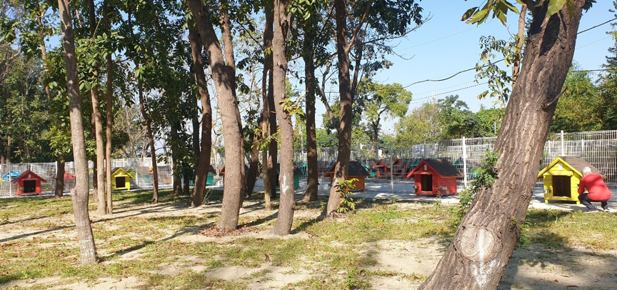 台南市政府が台糖から土地を借り受けて建設した「森の村」は、1ヘクタールの敷地面積を誇ります。緑豊かな木々、芝生、小川が、心地よい生態景観を作り出しています。2,500坪の犬舎は、トタン製の柵で6つのエリアに分かれており、推定200匹の犬を収容できます。台南市政府は、冬暖かく夏涼しい木製犬小屋90棟を購入し、鮮やかな色に塗装することで、森の村に活気を与えています。